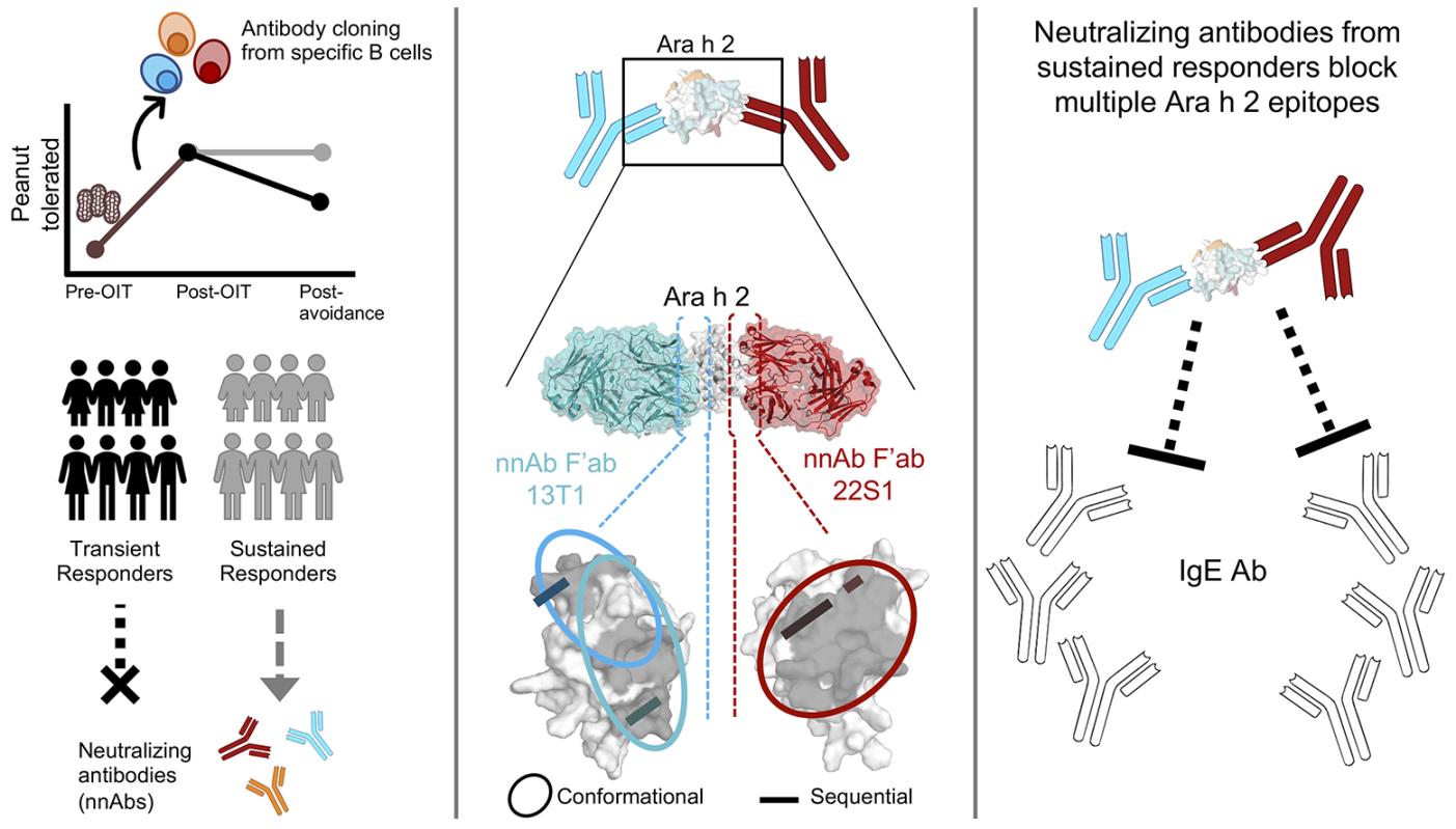 The authors compared antibodies from individuals with sustained or transient allergic responses, and discovered specific tolerance-associated conformational epitopes of the immunodominant allergen Ara h 2 recognized by neutralizing antibodies.