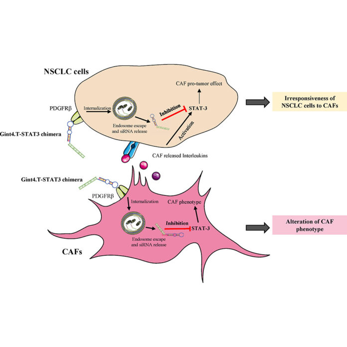 Scientists applied an aptamer-based conjugate, containing a signal transducer and activator of transcription-3 (STAT3) siRNA linked to an aptamer binding and inhibiting the platelet-derived growth factor receptor β, to obtain STAT3 specific silencing and interfere with CAF pro-tumorigenic functions.