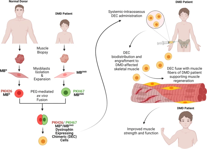 NewslettersCell Therapy NewsNeural Cell News Dystrophin Expressing Chimeric (DEC) Cell Therapy for Duchenne Muscular Dystrophy: A First-in-Human Study with Minimum 6 Months Follow-Up By Jamie Kang - April 3, 2023 0 270 Investigators presented a first-in-human study assessing the safety and efficacy of novel DEC cell therapy created by fusion of patient myoblasts with myoblasts of normal donor origin. [Stem Cell Reviews And Reports] Full ArticleGraphical Abstract