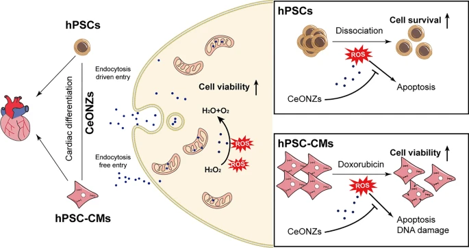 NewslettersESC & iPSC News Biosafe Cerium Oxide Nanozymes Protect Human Pluripotent Stem Cells and Cardiomyocytes from Oxidative Stress By Noshin Noorjahan - April 1, 2024 0 82 Scientists assessed the nanotoxicity of cerium oxide nanozymes and their potential antioxidant benefits in stressed hESCs and their derived cardiomyocytes. [Journal of Nanobiotechnology] Full ArticleGraphical Abstract
