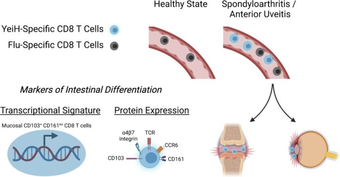NewslettersImmune Regulation News Mucosal Signatures of Pathogenic T Cells in HLA-B*27+ Anterior Uveitis and Axial Spondyloarthritis By lbeveridge - July 26, 2024 0 136 Investigators identified a bacterial peptide that could be presented by HLA-B*27 to expanded public T cell receptors in the joint in axSpA and the eye in B27AAU. [JCI Insight] AbstractGraphical Abstract