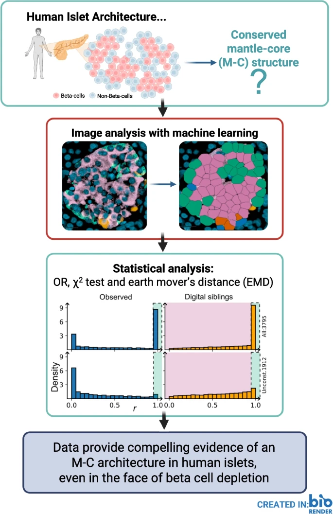The authors exploited advances in immunostaining, spatial biology and machine learning to undertake a detailed, systematic analysis of adult human islet architecture in health and T1D, by a quantitative analysis of a dataset of >250,000 endocrine cells in >3500 islets from ten individuals.