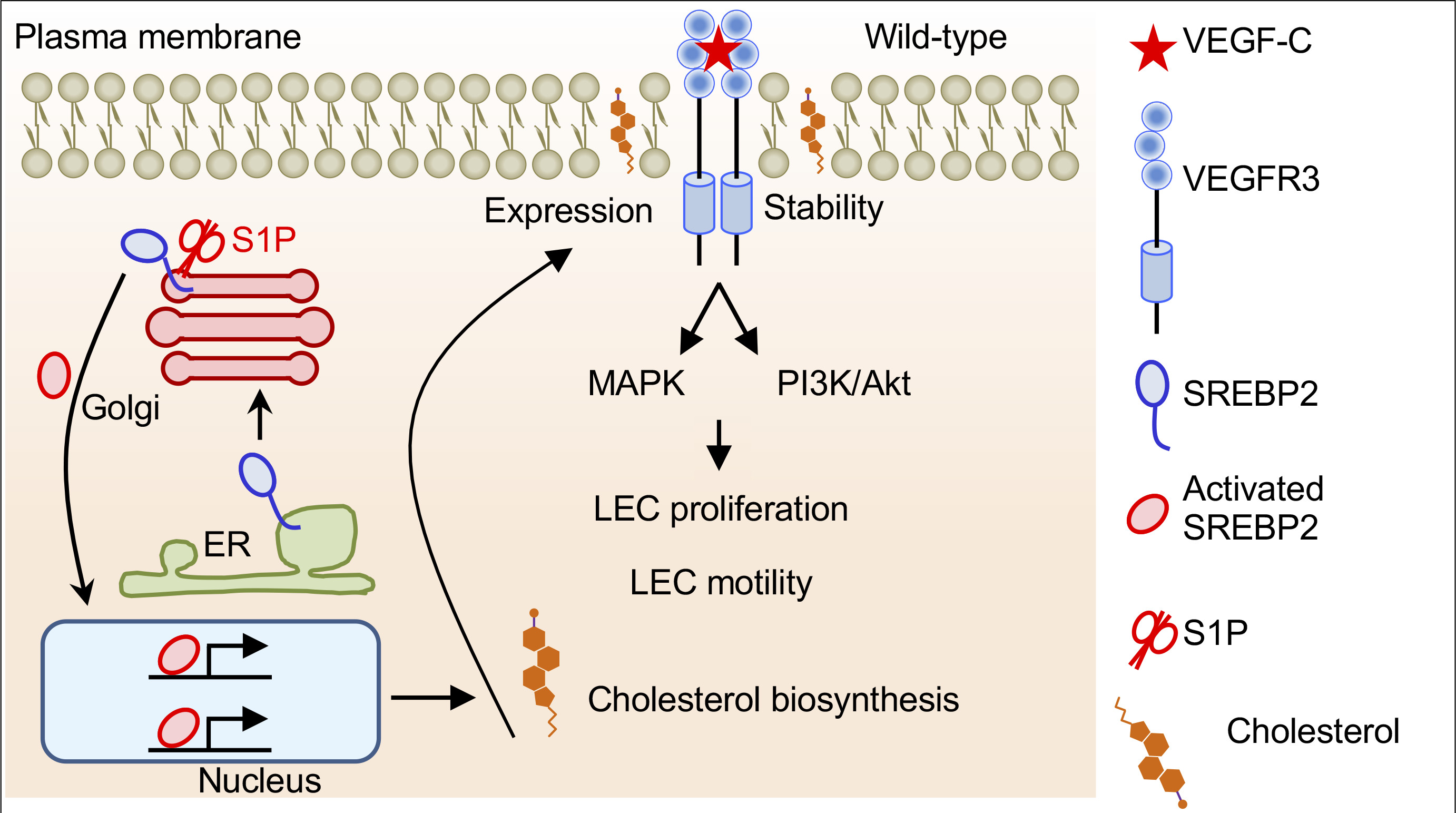 Investigators generated mice with pan-endothelial or lymphatic endothelial cells-specific deficiency of either site-1 protease (S1P) or sterol regulatory element-binding proteins 2. Mouse embryos with pan-endothelial deletion of S1P showed defective lymphatic vessel migration in skin and lymphedema, while their blood vasculature formation was relatively normal.